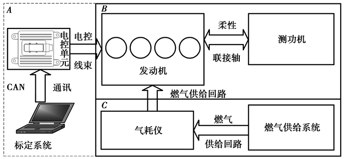 3 发动机台架试验 3.1 发动机功率扭矩试验采用上述单一ECU两用燃料发动机电控系统和相应的控制策略,以某款排量为1.6 L发动机为对象,搭建试验台架,其布置方案如图 4所示,进行台架基础标定及性能试验。
