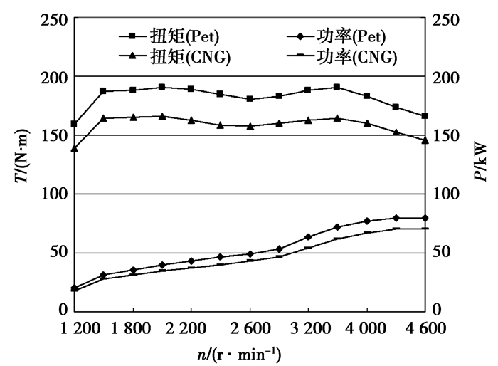 3.2 发动机性能指标对比总功率试验时,环境温度为17 ℃,大气压力为97.15 kPa,使用的燃料为市售车用天然气。按国家标准计算出校正系数α为1.006[14-15]。校正后发动机在不同转速下的功率、扭矩如图 5所示。