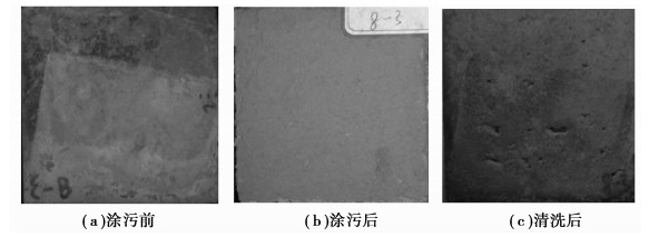 试件涂污前、涂污后及干冰清洗后的状态如图 1所示。采用拭擦法判别试件是否清洗干净。干冰清洗后用白色湿巾擦拭混凝土表面,来回拭擦3次,对比擦拭前后的湿巾,无差异时判定为清洗干净。