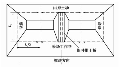 露天矿临时排土桥一般有两种设置方式:单桥和双桥,其核心是保持剥离运输系统的通畅性。季节性剥离露天矿的矿山工程发展有其自身的特点,剥离作业呈现间歇性。正是这种间歇性,使得剥离运输系统没有不间断维持通畅性的必要,即在非剥离作业时期,剥离运输系统可以中断。季节性剥离露天矿临时排土桥的修筑巧妙地利用了这一特点,只在采场中部建立单桥,剥离作业期间修筑排土桥,非剥离作业期部分(全部)拆除排土桥,回采桥下压煤。而不必建立迈步式交替发展的双桥,可大大减少修筑、拆除临时排土桥的工程量与工程费用,降低系统复杂程度和施工难度。