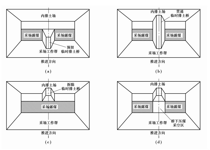 2 临时排土桥模型及其参数优化 2.1 临时排土桥发展演变过程季节性剥离露天矿的临时排土桥随剥离工程的发展而变化。在采场工作帮推进过程中,预先留设部分临时排土桥(图 3(a));剥离工程作业时,利用剥离物回填采空区,贯通临时排土桥,建立运输通路(图 3(b));剥离工程竣工后,部分拆除临时排土桥,揭露排土桥下压煤,运输通路中断(图 3(c));次年剥离工程开工前,优先回采揭露的临时排土桥下压煤(图 3(d)),剥离工程开工后,利用剥离物回填桥下压煤采空区,贯通临时排土桥,恢复运输通路。综上所述,临时排土桥处于修筑-拆除-修筑的动态循环演变过程中。在这一过程中,不可避免地出现由于拆除临时排土桥而产生的二次剥离,且临时排土桥的高度越高,二次剥离量越大,剥离费用越高;同时,临时排土桥越高,剥离物从采场排弃至内排土场所产生的反向运输越少,反向运输费用越少。为此,有必要研究使反向运输费用与二次剥离费用总和最小的临时排土桥参数,为确定露天矿经济合理的临时排土桥参数提供理论支持。