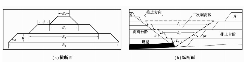 西二矿位于内蒙古锡林浩特市,设计生产能力为10.0 Mt/a,是典型的近水平煤层季节性剥离露天煤矿。主采煤层为6号煤层,采场工作帮地表至煤底板的距离H′=110 m,剥离工作线平均长度Lg=1.85 km,运输平台宽度d=20 m,排土台阶高度H=24 m,排土台阶坡面角α=33°,采场工作帮坡角θ=17.5°,排土场的稳定帮坡角γ=14°。
