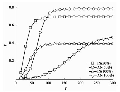 下面的实验是比较初始在独立集中随机免疫一定比例的节点与在全网络中随机免疫相同数目的节点,再随机感染网络中的10个节点,对比这2种免疫方法对传播的影响。网络模型为BA、传播模型是SI,传播方式和模型参数与图 1的实验相同。图 4中IN、AN分别表示的是,IN:初始随机免疫第一大独立集里的一定比例的节点,然后随机感染全网络10个节点,让流行病传播;AN:初始随机免疫全网络中相同数目的节点(与独立集中免疫的节点数目相同),同样随机感染全网络10个节点,让流行病传播。在传播平衡时,I态节点越少说明免疫的效果越好。
