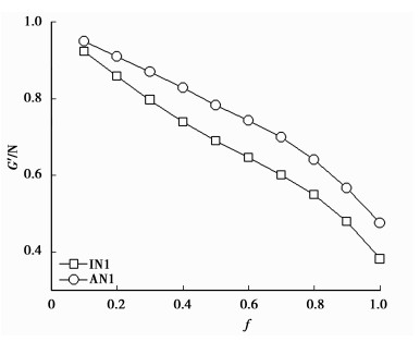 图 2是对以上2种免疫策略网络鲁棒性的研究。横轴表示免疫第一大独立集中节点的百分比(从10%到100%),纵轴表示免疫后网络中最大连通子图的节点数占整个网络总节点数目的比例。IN1代表免疫第一大独立集中度数最大的一定比例的节点;AN1代表免疫全网络中度数最大的节点,要求免疫节点的总度数和等于独立集中免疫节点度数和。实验结果表明,在免疫最大度节点总度数和相等的条件下,对独立集的目标免疫与全网络目标免疫相比较,独立集的免疫策略使网络最大连通子图更小,即独立集的目标免疫策略使网络受到更大的破坏,这也是对独立集的免疫比在全网络中进行免疫效果更好的原因。其中独立集中的节点肯定不相邻,确保所选择的节点在整个网络中更加分散,因此对独立集中的节点的免疫使网络更加破碎,这验证了前面提出的“独立集免疫策略使网络的最大连通分支的规模更小”的观点。对于其他独立集的实验有相似的结论,这里没有一一画出。