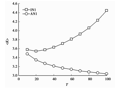 下面的实验同样是免疫独立集和全网络中最大度节点、节点总度数和相等,检验免疫后网络最大连通子图的平均度。得到对独立集免疫时,最大连通子图的平均度增加,而对全网络免疫时,最大连通子图的平均度减少。在图 3中,IN1是免疫第一大独立集中一定比例的最大度节点,并统计这些节点的度之和,设为“SUM”;AN1是免疫整个网络中,一定数量度数最大的节点,使这些节点的度之和等于“SUM”。