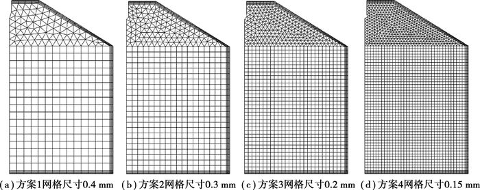 3.1 网格密度对仿真的影响及网格无关性分析网格密度是影响仿真计算的重要因素,一方面如果网格密度过小,则会增加离散误差;另一方面,随网格密度的增加,无反应流场的计算时间和化学反应计算总时间都将急速增加,增加计算成本。为了找到既满足计算精度,又具有相对较小计算成本的网格划分方案,对不同的网格密度方案进行分析。图 1显示了4个网格方案,方案1网格密度最小,网格尺寸为0.4 mm,方案4网格密度最大,网格尺寸为0.15 mm,计算中所有参数均保持相同。计算发现方案1~方案4在一台P4 2.5G CPU/3.5G DDR的计算机配置下所需的计算时间分别为10、12、16、23 h,可见随网格数量的增加,计算时间加速增加,影响很大。