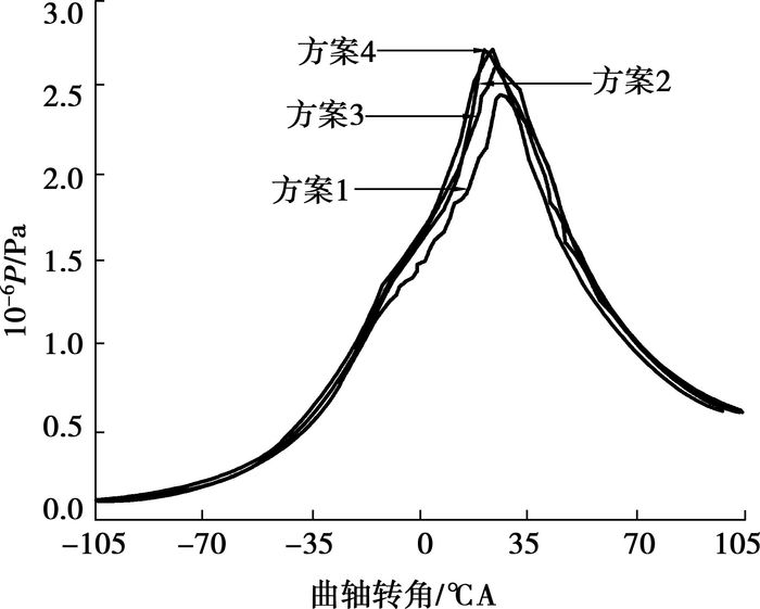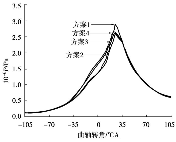 图 2显示的是不同网格密度下的缸内压力对比图。缸压用P表示,由图可以看到方案1和方案2的着火时刻点稍微晚一些,压力升高率小于另外两个方案,而方案3和方案4的缸压曲线基本一致。这主要是由于方案1和方案2的网格密度相对较小,因此,近壁区网格内的混合气相对较多,受到壁面低温影响的区域相对较大,所以缸内平均温度相对较低,着火点略有滞后。可见当网格尺寸减小到0.2 mm以后,再进一步减小25%并不能带来解的明显变化,可认为此时解具有网格独立性,综合考虑计算时间成本,最后取网格尺寸为0.2 mm,即方案3。