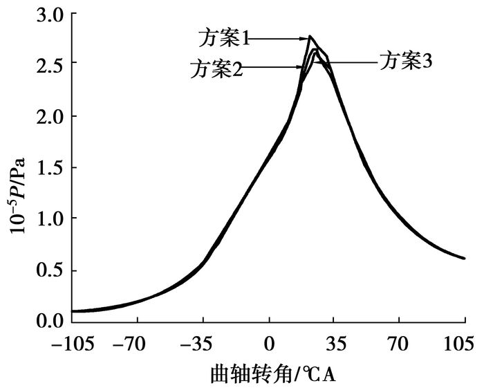 当确定了时间步长后,步长内的最大迭代步数将会影响时间步长内的计算精度,从而影响下一时间步的初始值,进而影响整个计算结果。图 4显示了当步长为0.1 ℃A时,最大迭代步数分别为方案1的50步、方案2的100步和方案3的150步的缸内压力对比,计算时将收敛指数设置为较小的判断值,以使3个案例下都能算到最大步数。由图可见,主要在上止点附近有较大差别,当步数从100增加到150时,差异已经比较小,综合考虑,最后选取迭代步数为100,即方案2。