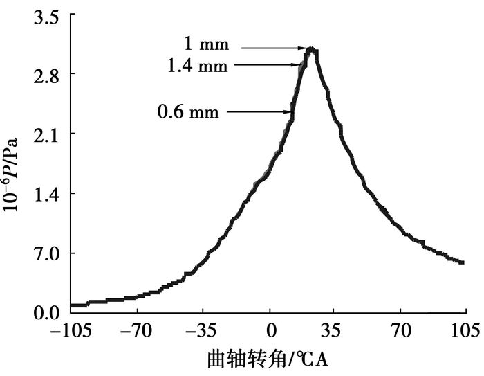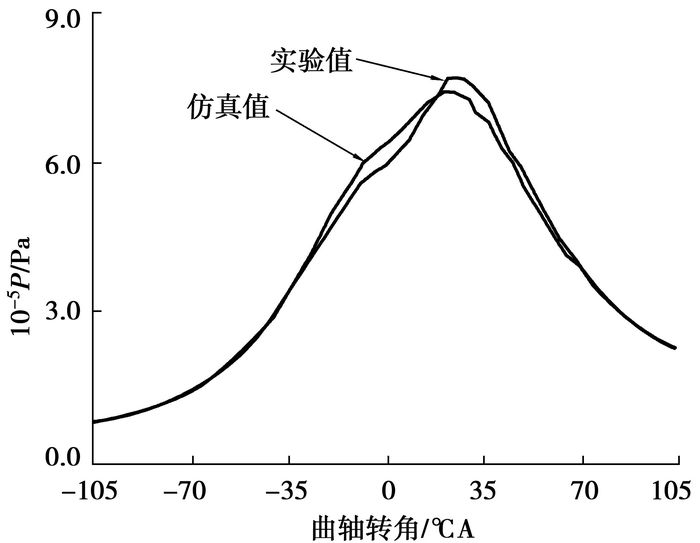 在上述讨论结果的基础上,将仿真结果与实验结果进行对比,对比工况为初始压力0.69 atm, 初始温度370 K,转速6 000 r/min,当量比1.8,缸径10.8 mm,压缩比7.6,图 5显示仿真结果与实验结果比较吻合,说明建模误差较小。综合上述比较和分析,仿真结果有效。