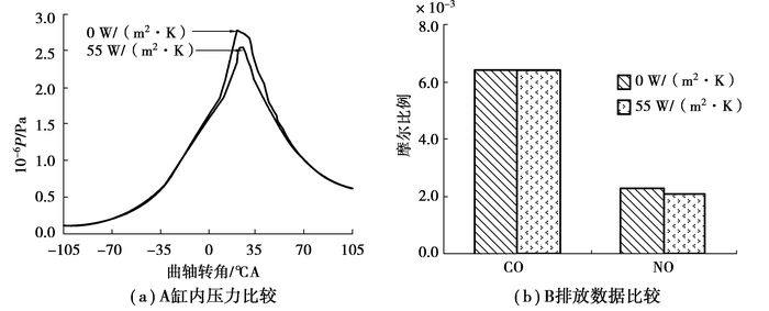 3) 散热系数对燃烧特性有较明显的影响。散热系数从0增加到55 W/(m2·K)时,平均压力升高率减小,着火点延后,最高压力值下降了2个大气压,散热系数通过影响燃烧室内的温度从而影响NO排放特性。