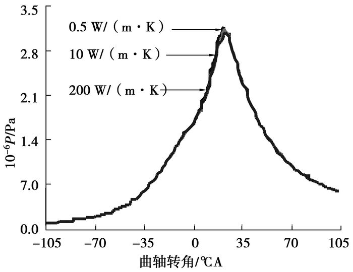 图 7和图 8分别为不同缸壁厚度和材料下的燃烧性能图,工况为初始压力1 atm, 初始温度370 K,转速为4 000 r/min,当量比1.0,压缩比7.6。从图 7和图 8发现,对于微型发动机,缸壁面厚度从0.5 mm增加到1.4 mm和壁面导热系数从0.5 W/(m·K)增加到200 W/(m·K)时,缸内压力变化非常小,可认为燃烧过程差别不大。这主要是由于在热量从缸内传出到外界环境热流路径中,主要传热热阻是外壁面与环境之间的对流换热热阻,所以缸壁面参数变动对总的散热影响不大,从而对燃烧过程影响很小。