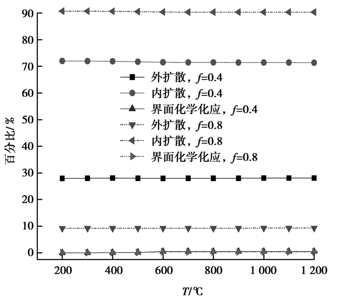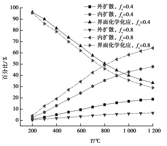 CO还原球团矿时,扩散阻力所占百分比均随温度增大而升高,而界面化学反应阻力所占比例则相应降低。当温度较低时,界面还原反应速率较低,此时,界面化学反应为限制环节;随着温度升高,界面处还原反应速率逐渐增大,其影响相应减小,此时,球团矿中由熔融产物层产生,内扩散阻力增大,该升温还原阶段为界面化学反应和内扩散混合控制;当温度超过800 ℃时,熔融产物逐渐增厚,界面处还原反应速率继续增大,内扩散阻力成为限制环节。结合图 3所示,相同温度条件下,当还原度较小时,还原反应速率较快;fs=0.1及0.2时,反应速率随温度呈现出线性变化,这主要是因为低还原度下,扩散阻力及界面化学反应阻力随温度变化较小。图 2中,随着反应进行,还原度相应增大,反应界面逐渐深入到球团内部,内扩散阻力增加,而外扩散阻力所占比例相应减少,界面化学反应阻力所受影响较小