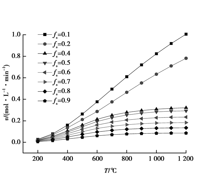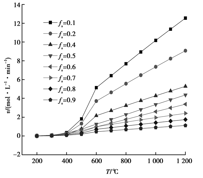图 6反映了当fs=0.2时,不同氢碳比的还原气还原球团矿时反应速率随温度的变化关系。混合气反应速率均随温度升高而增大,当温度小于500 ℃时,混合气及纯CO还原速率均大于纯H2还原时的速率;当温度大于500 ℃时,采用纯H2还原时的反应速率显著增大,且均大于其余成分的还原速率。同时,随着CO体积分数的增加。H2的体积分数降低,反应速率降低。