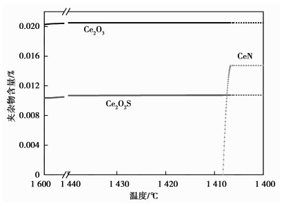 图 1为253MA耐热钢标准成分范围内本模型的计算结果,纵坐标表示冷却及凝固过程中夹杂物的总量,以下略同。由图可知,钢中的夹杂物主要为Ce2O3、Ce2O2S及CeN。Ce2O3、Ce2O2S在炼钢温度(1 600 ℃)已经析出,且在凝固过程中析出量不再增加,CeN夹杂在凝固末期析出。