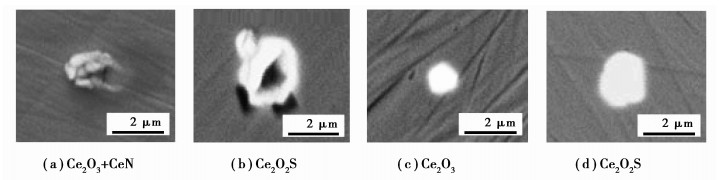 图 2为工业试验(图(a),图(b))及高温模拟实验(图(c),图(d))取样分析的扫描电镜结果。从图中可知,工业试验的凝固试样中的夹杂物主要为Ce2O2S,Ce2O3及CeN,其中,CeN与Ce2O3共生,应为凝固过程中在Ce2O3夹杂上析出。高温模拟实验则发现,在1 600 ℃时,钢中的夹杂物主要为2 μm及以下的Ce2O3与Ce2O2S夹杂物。