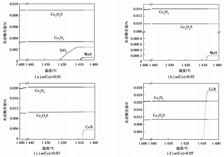 2 计算结果与分析图 3表示不同铈添加量条件下,253MA耐热钢凝固过程中夹杂物的析出行为。铈的添加量设定为0.01%,0.02%,0.03%,0.04%(图 1),0.05%。从图中可以看出,随着铈添加量的增加,钢中的夹杂物类型由Ce2O2S、Ce2O3、SiO2、MnS向Ce2O2S、Ce2O3及CeN转变。其中Ce2O2S、Ce2O3在炼钢温度下已经析出,且在凝固过程中的析出总量不再增加;SiO2与MnS则在凝固过程中析出,并随钢液温度的降低逐渐达到析出平衡。对比图 3(a)、(b)可知,MnS的析出温度随铈添加量的增加而降低,分析认为,钢中的[S]参与Ce2O2S的生成反应,并且[Ce]与[S]的相互作用系数为负,两者同时作用降低了钢中的[S]活度,从而MnS的析出温度降低。对比图 3(c)、图 1及图 3(d)可知,由于钢中铈含量的增加,CeN的析出量不断增加,且析出温度有升高趋势。