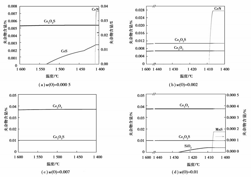 2) 随着初始氧含量的增加,钢中的CeN,CeS消失,并开始析出Ce2O3,SiO2及MnS,其中,SiO2与MnS在凝固过程中析出;
