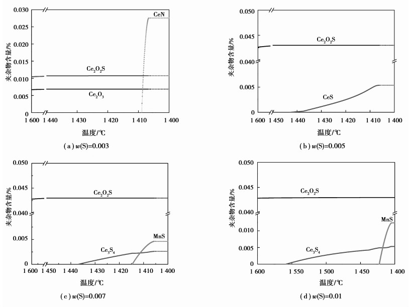 3) 随着初始硫含量的增加,钢中的Ce2O3消失,CeS先析出后消失,钢中开始析出Ce3S4与MnS,在凝固过程中析出的Ce3S4逐渐在液相线温度以上析出。