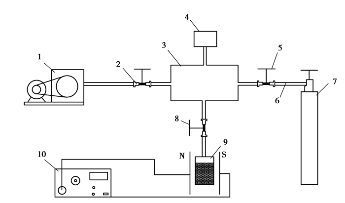 图 1 瓦斯放散磁效应的实验装备 Figure 1 The experience equipment of gas emission magnetic effect 注:1—真空泵;2,5,8—电磁阀;3—放散空间;4—压力传感器;6—管路;7—瓦斯气源;9—煤样瓶;10—恒定磁场 |