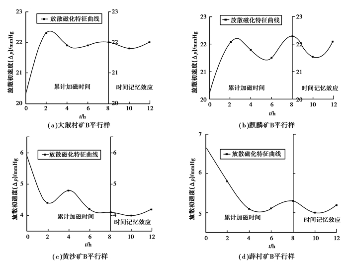 3) 从图 3可以看出,煤样在加磁后,放散初速度呈现上下波动,并一定程度的增大或减小,说明磁场可以改变含瓦斯煤体的放散特性,同时恒定磁场对含瓦斯煤体的放散特征具有明显的时间记忆效应,即在撤掉电场时Δp并未回落至初始值,保持一定的记忆过程,使煤体发生了塑性损伤。