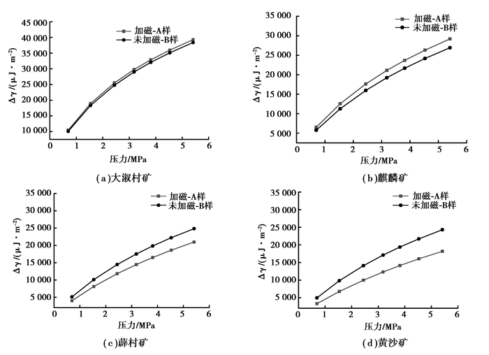 2 恒定磁场对瓦斯放散作用机理 2.1 恒定磁场下不同破坏程度煤体表面能与瓦斯放散性物质的表面具有表面张力,当煤吸附甲烷气体时会引起表面张力的降低,而表面吉布斯自由能也可以看作是垂直作用在单位长度界面上的力,即表面张力。在外加磁场作用下,根据吉布斯公式可以计算出煤表面张力的变化,结合煤的Langmuir方程和实验数据(平衡压力P和吸附量Q)可以计算出煤表面能降低值Δγ(J/m2),如式(1)所示。