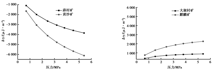 式中:Δγ为表面能降低值,表示干净的煤表面(未吸附状态)自由能与吸附气体之后煤表面能的差值,J/m2;S为比表面积,S[18]=4.866 7×a,m2/g;Q0为甲烷气体摩尔体积,22.4 L/mol;a为单层饱和吸附量,cm3/g;b为吸附平衡常数,无量纲,MPa-1;T为绝对温度,303.15 K;R为气体常数,8.314 41 J/mol·K。