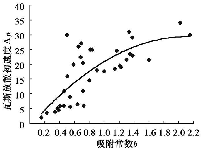 图 6 吸附常数b与瓦斯放散初速度的关系图[21] Figure 6 Relationship of Irradiation velocity and adsorption constant b |