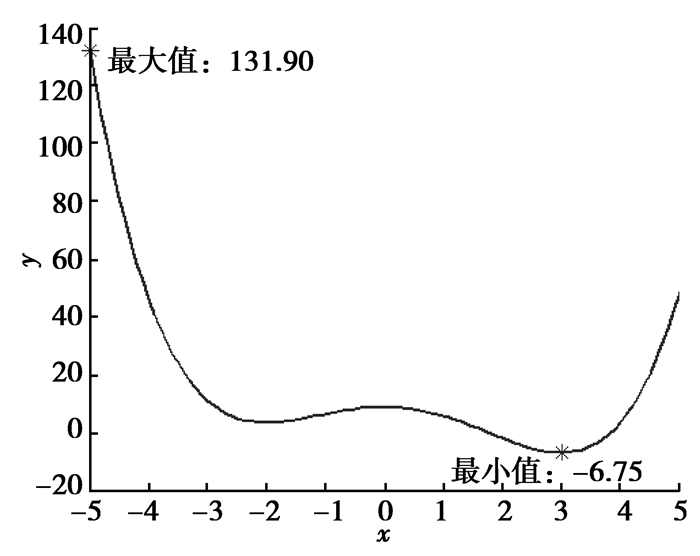 1.5 3种区间求解方法的对比为便于对比,取数值函数y=x4/4-x3/3-3x2+9为例,其中,x∈[-5, 5],该数值函数的理论变化区间为y∈[-6.75, 131.90],如图 1所示。