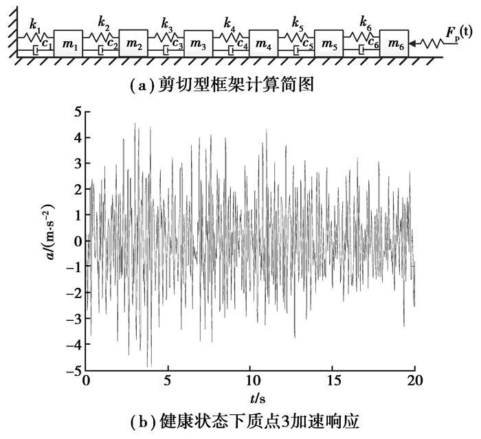 3 框架结构算例分析 3.1 数值算例取图 3所示的6自由度集中质量弹簧模型作为剪切型框架结构的简化模型,其中,各质量取为m1=m2=1,m3=m4=0.8,m5=m6=0.5;各弹簧的刚度取值为k1=k6=1 500,k2=k3=1 200,m4=m5=1 000。体系的阻尼设为瑞雷比例阻尼,即
