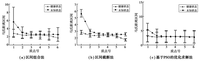 图 4 工况1下3种算法的马氏距离区间 Figure 4 The interval of MD under damage case 1 |