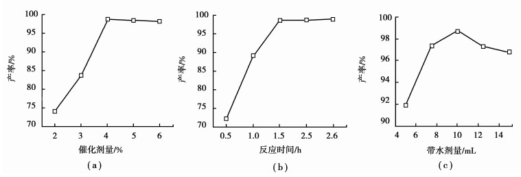 2.3 响应面分析法优化乙酸异戊酯的合成根据Box-Benhnken的中心组合试验设计原理,利用响应面设计软件(Version 6.0.5, Stat-Ease. Inc., USA)对乙酸与异戊醇的酯化反应条件进行优化。在单因素试验的基础上,以催化剂用量、反应时间和带水剂量为参考因素,乙酸异戊酯的产率为响应值进行试验设计。试验因素和水平设计见表 2。