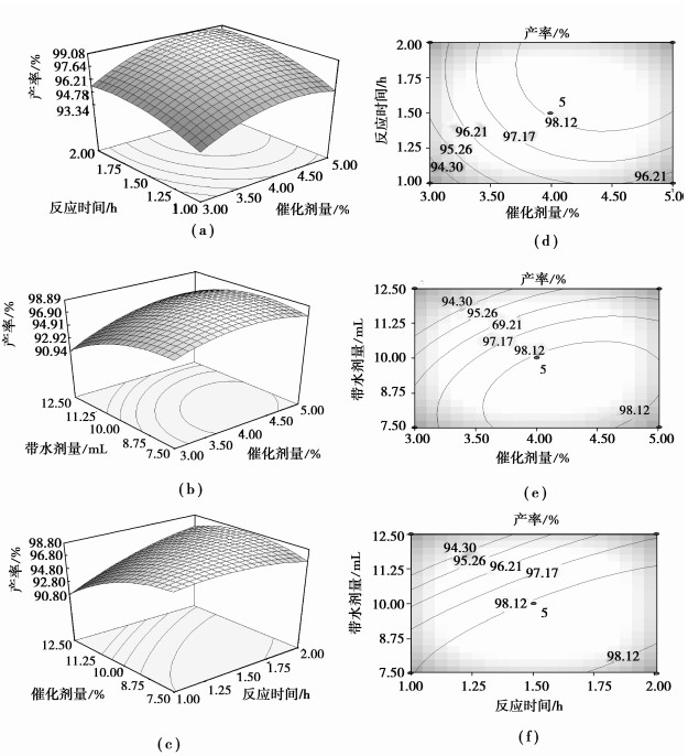 图 2(c)和(f)为反应时间和带水剂量的交互作用。由响应面图 2(c)可知,带水剂量对乙酸异戊酯产率的影响相对于反应时间更为显著,这从带水剂量曲线相对于反应时间曲线表现的更为陡峭可以看出。从图 2(f)可以看出,等高线图为斜椭圆形,也表明两因素的交互作用对乙酸异戊酯产率具有显著影响。