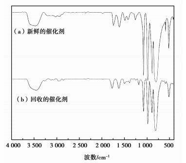 图 4 新鲜催化剂与回收催化剂的FT-IR谱图 Figure 4 FT-IR spectra of the fresh [GlyH]1.0H2.0PW12O40 and the corresponding spent catalyst regenerated after six consecutive cycles |