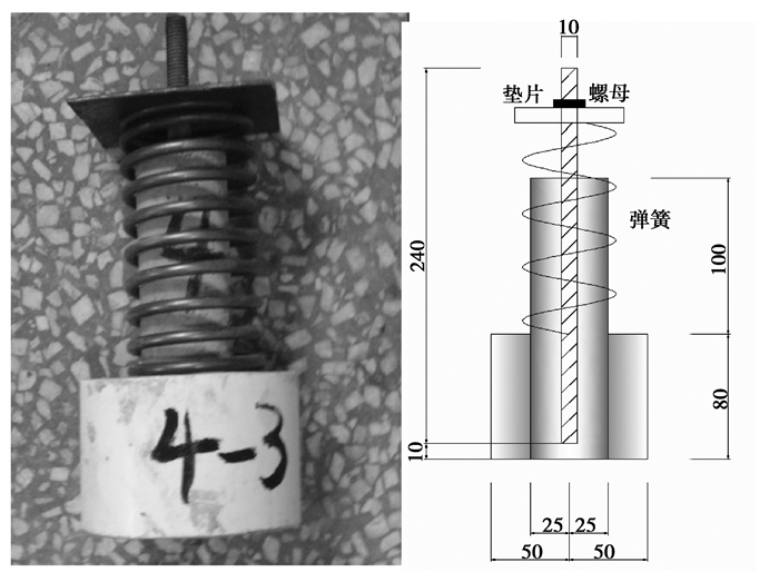 1 砂浆锚固体腐蚀SEM图像处理及分形 1.1 砂浆锚固体腐蚀试验砂浆锚固体腐蚀试验分锚杆未受力和受力(受拉)2种工况,为模拟锚固体受力的工作状态,这里采用高精度、高适应性不锈钢弹簧加载装置系统模拟锚固体受拉状态下的腐蚀过程。水泥砂浆锚固体在工作时会承受各种荷载,其内部的剪应力比一般为砂浆锚固体强度的0.25~0.5,随着时间的增长,砂浆锚固体抗剪强度将逐年下降,采用了0(未受力)、0.3(受拉)2组应力比进行试验。该试验装置应用虎克定理,预先测量弹簧弹性模量,通过控制压缩距离,从而控制对砂浆锚固体施加的应力。该加载系统装置的试件尺寸如图 1所示。