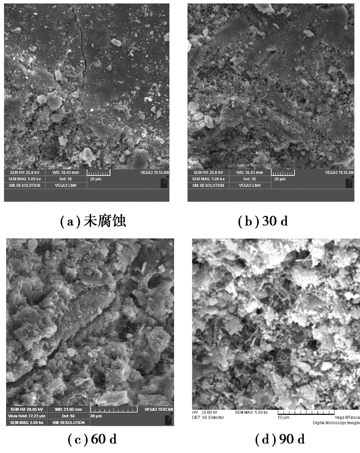 从表 3可以看出,试样从未腐蚀到腐蚀,孔隙数量逐渐减少,而孔隙平均面积、平均直径均增大,说明孔隙逐渐从小孔隙向大孔隙转变,这与压汞试验得出的结论是相符的。