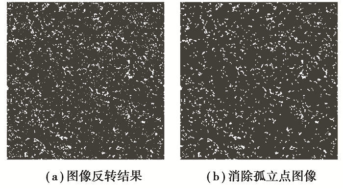 图像经过二值化后,总有少数毛刺和孤立的点存在,这些点的存在对孔隙特征提取是不利的,会加大定量统计的误差。基本的形态学方法经笔者多次试算后,误差较大,不适用于对空隙孤立点的去除。查阅相关文献,发现bwareaopen函数可删除二值图像中面积小于一定值的对象,经过大量试算,面积阀值取为5。以图 4(a)为例进行说明,其他图像做同样处理。为与孔隙特征的测定联系起来,先将图像进行反转,即白色变为黑色,黑色变为白色。