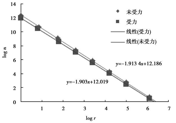 从所得结果可以看出,未受力工况下和受力工况下,孔隙分形维数均随着腐蚀时间的增加而降低;同一腐蚀时期,受力工况下的分形维数略小于未受力工况下的分形维数。