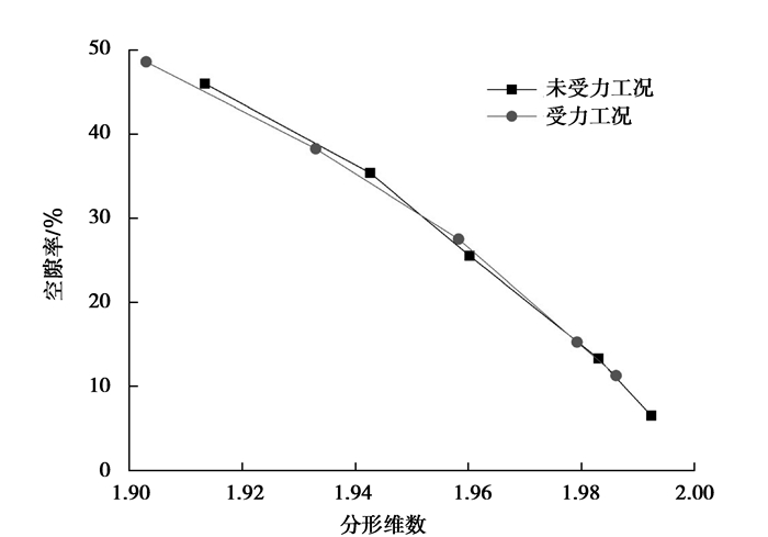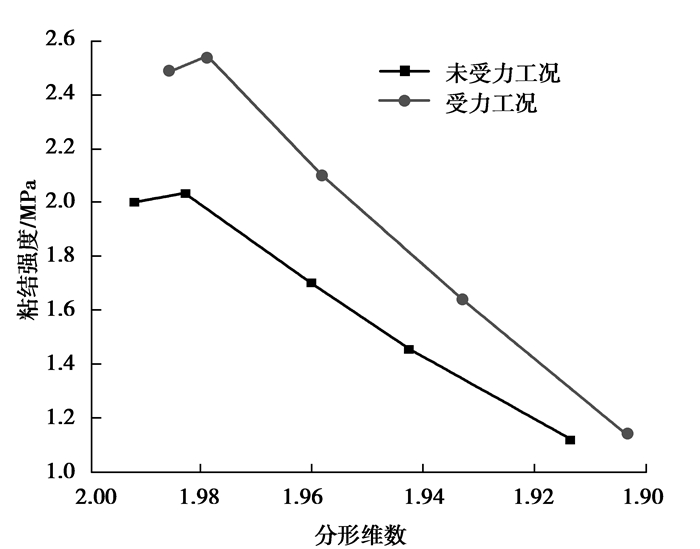 2) 分形维数和孔隙率成负线性关系,分形维数越小,孔隙率越大;随着分形维数降低,未受力与受力工况下砂浆锚固体的粘结强度都是先增大后减小的趋势,受力工况的砂浆锚固体粘结强度下降速度快于未受力工况。