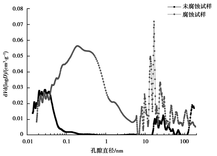 2.1.2 试验结果与分析关于孔径分布,图 9表示进汞体积对孔径微分曲线,横坐标表示孔隙直径,纵坐标表示进汞量对孔隙直径的微分,其值越大,表示该点所对应直径的孔隙进汞量就越大,孔隙数量就越多。从图中可以看出,随着腐蚀的进行,孔隙直径分布逐渐从小孔向大孔方向发展,且大孔数量逐渐增多,而小孔数量逐渐减少。