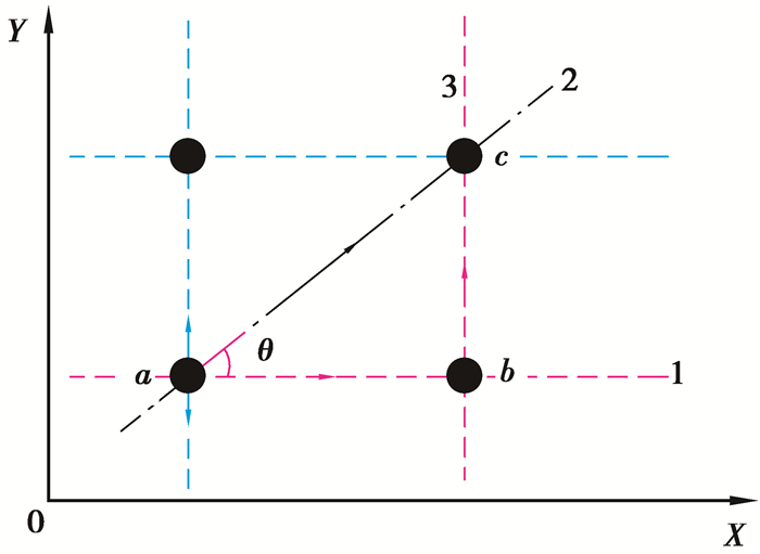 2.2 速度条件为了简便, 在文中假设前提下, 考虑无边界无阻力二维情况。如图 2所示, 分别设粒子A、B、C所在的位置为a、b、c, 粒子A受到外界激励成为振动信息源, 振动沿着y方向传递, 该信息通过虚粒子向四处扩散。粒子C获得信息的途径有3条, 图 2中分别表示为红色、蓝色和黑色路径, 由于对称性, 只需要研究红色和黑色路径, 即abc路径和ac路径。