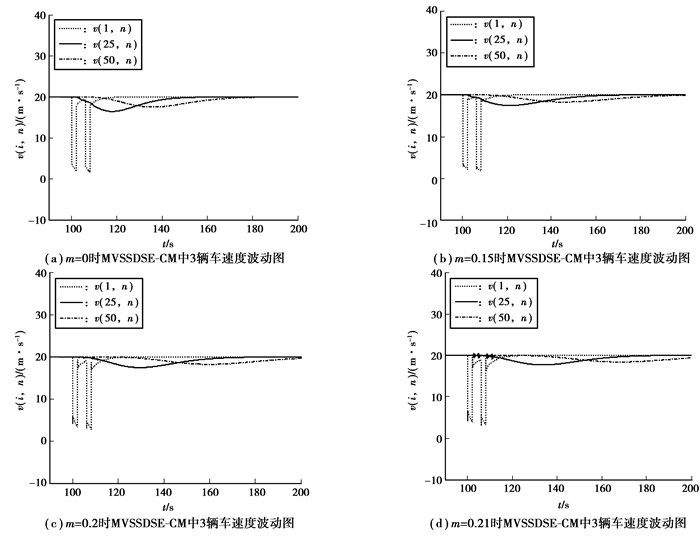 在车流运行模拟过程中, 将车队中头车在100 s和106 s处分别停止3 s来观察车流运行状态。图 1分别显示了不同m值(即m=0, 0.15, 0.20和0.21)下MVSSDSE-CM的第1辆车、第25辆车和第50辆车的速度波动情况(图中t=nT)。当m=0时, MVSSDSE-CM简化成OV模型。由图 1(a)可见, 3辆车的车速波动幅度很大, 第25辆车和第50辆车随着时间的演化, 其车速最终逐渐趋于稳定。图 1(b)与图 1(c)较图 1(a), 车速波动幅度更小, 车流平稳性能更好, 而图 1(c)中的车流的稳定性能最优; 图 1(d)中, 头车停止后, 第25辆车车速在20 m/s上下小范围剧烈波动, 即车流不稳定, 与理论推导结果不一致。因此, 文中选择m=0.2为MVSSDSE-CM最优反馈增益。