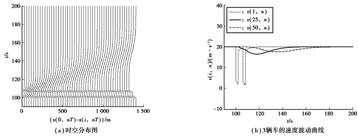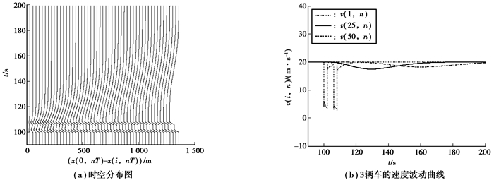 从图 2(a)和3(a)对比可以看出:2幅图中车头间距波动均较小, 无晶振现象, 但图 3(a)中交通拥堵抑制效果更好, 车头间距扰动向上游区域传播, 能更快地恢复到稳定状态。对比图 2(b)和3(b)可以发现:ITS-CM和MVSSDSE-CM中3辆车的车速均在20 m/s两侧波动, 但图 3(b)中3辆车的速度波动明显比图 2(b)中的要小, 整个车流系统的稳定性能得到进一步提升。仿真结果表明, 文中提出的MVSSDSE-CM较ITS-CM更能降低了拥堵的影响范围, 使得车流恢复稳定状态能力更强。