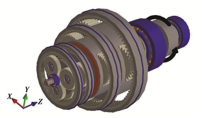 利用Romax软件建立包含齿轮、轴和轴承的4级行星传动系统三维实体模型,如图 1所示,各行星级中太阳轮为输入部件,行星架为输出部件,内齿圈与箱体固接。功率由1级太阳轮输入,经1级行星架传递到2级太阳轮,再经第2级、第3级行星轮系传递到第4级行星轮系,由4级行星架输出并驱动输出齿轮轴,输出齿轮轴与齿条啮合实现升降运动。齿轮传动系统中除行星轴上的轴承外,仅1级太阳轮、4级行星架和输出齿轮轴上存在与箱体接触的轴承,各级太阳轮及行星架均浮动。将齿轮齿条啮合副的受力转化为力和转矩施加到输出齿轮轴上,对4级行星传动系统进行静力分析,并提取轴承的支撑刚度[10]。