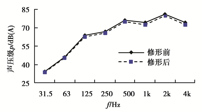 由表可知,修形前齿轮箱各场点辐射噪声最大值为83.3 dB(A),出现在场点2处,修形后减小为81.8 dB(A),且各场点辐射噪声结果均有所减小。图 12给出了修形前后场点2的声压级频响曲线,最大值均位于2 kHz处。