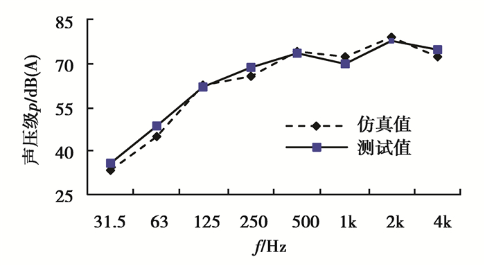 利用NL-42型声级计采集4级行星齿轮箱在4个场点的总声压级。各场点的总声压级如表 7所示。由表可知,齿轮箱实测总声压级最大值为81.4dB(A),位于场点2处,测试与仿真所得的总声压级最大值相差0.49%,各场点总声压级的相对误差最大值为3.64%,仿真与测试结果吻合良好。图 15给出了场点2处测试和计算所得的声压级频响曲线。