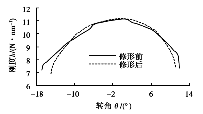 基于含修形量的齿廓坐标建立齿轮副模型,利用接触有限元法求解修形前后齿轮副啮合过程中的轮齿接触力和齿面变形,计算可得齿轮副啮合刚度。图 4给出了修形前后第1级行星轮系外啮合齿轮副的单齿啮合刚度曲线。由图 4可知,在啮入和啮出位置,修形后齿轮副的单齿啮合刚度降低,单齿接触对应的转角范围也有所减小,齿轮副提前进入啮合和滞后退出啮合现象得到改善。
