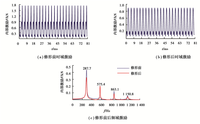 修形后齿轮副冲击激励和刚度激励将发生变化,其中啮合冲击激励大幅减小。若忽略冲击激励,则内部动态激励可表示为
