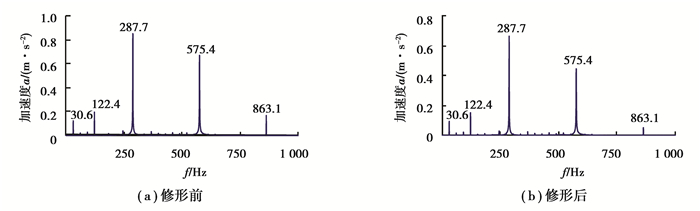 图 8给出了修形前后4级行星齿轮箱评价点1的X向振动加速度频域响应曲线。修形前后振动响应的峰值频率较为一致,主要出现在863.1,575.4,287.7,122.4和30.6 Hz,均为啮合频率或其倍频,修形前的振动加速度最大峰值为0.846 m/s2,出现在287.7 Hz处,修形后减小到0.66 m/s2。
