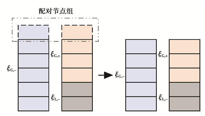 ③ 从(ξG', +, ξG, -)首端各取一个控制节点构成配对节点组,根据功率调节量的计算公式进行注入功率调整(详见3.2节)。在实际计算中,每次配对节点组的注入功率调整完毕,其中至少有一个控制节点达到最大调节能力,此时将该控制节点从相应的控制节点集合中删除。