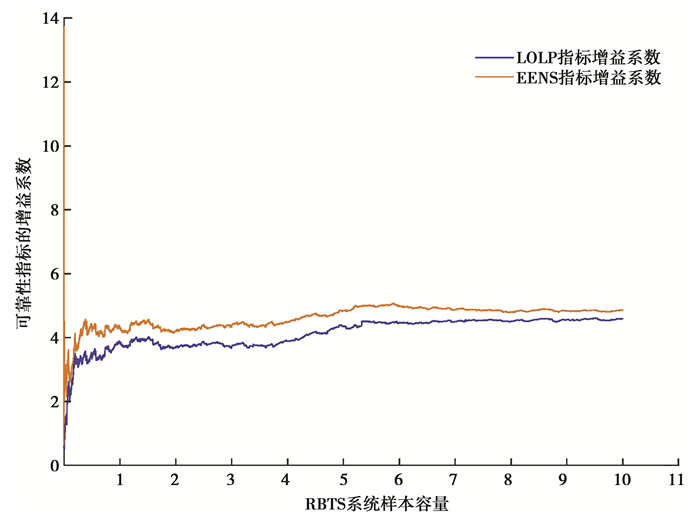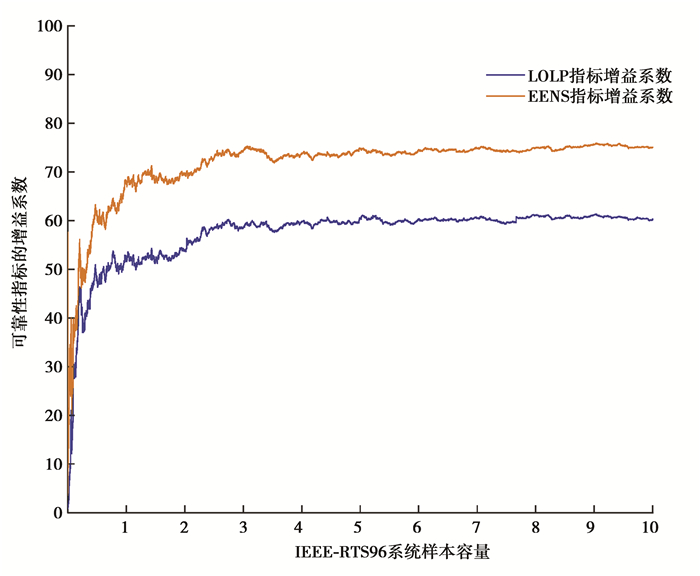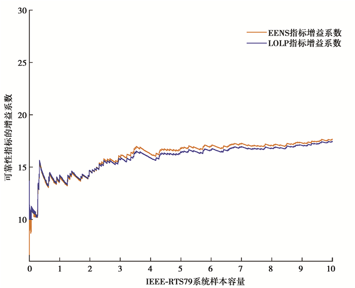分别采用缺供电量和失负荷概率指标的方差系数来衡量可靠性评估结果的准确性,采用固定抽样样本数,图 3~5给出了以基于潮流灵敏度的常规启发式负荷削减模型为参考,本文模型的增益系数变化过程。可见本文模型效率更好,原因如下: